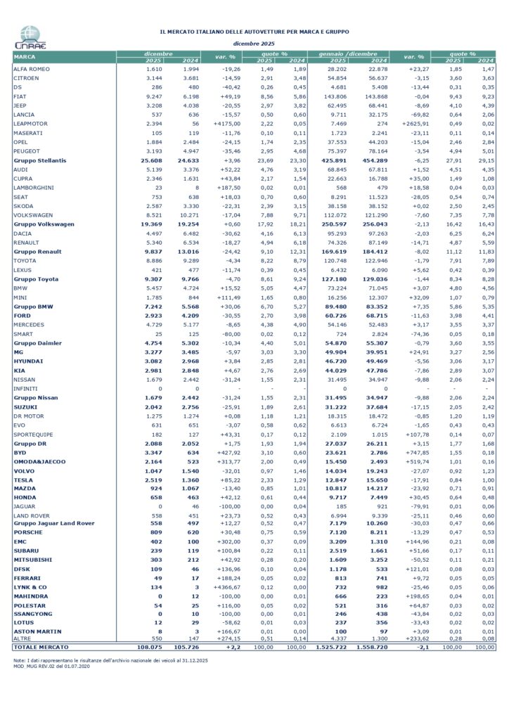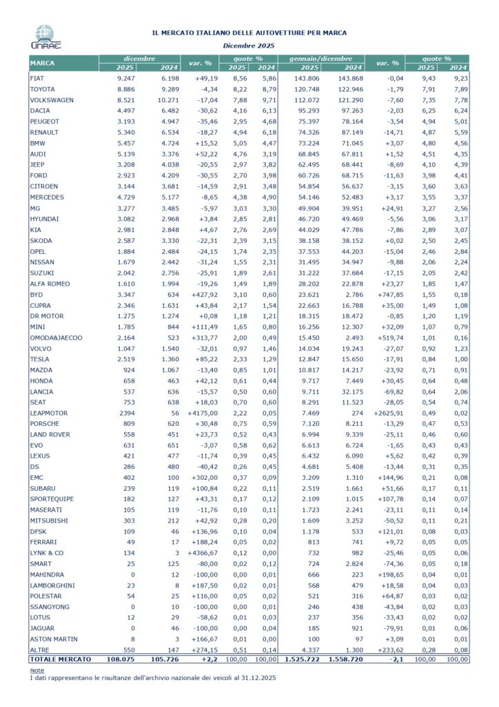 Il mercato delle autovetture in Italia chiude il 2025 in linea con le previsioni formulate da UNRAE, attestandosi a 1.525.722 immatricolazioni complessive, in flessione del 2,1% rispetto alle 1.558.720 unità dell’anno precedente, e confermando un divario del 20,4% rispetto ai livelli del 2019. L’ultimo mese dell’anno contribuisce con un lieve segno positivo: con 108.075 vetture immatricolate, dicembre segna un incremento del 2,2% rispetto alle 105.726 unità registrate nello stesso periodo del 2024.