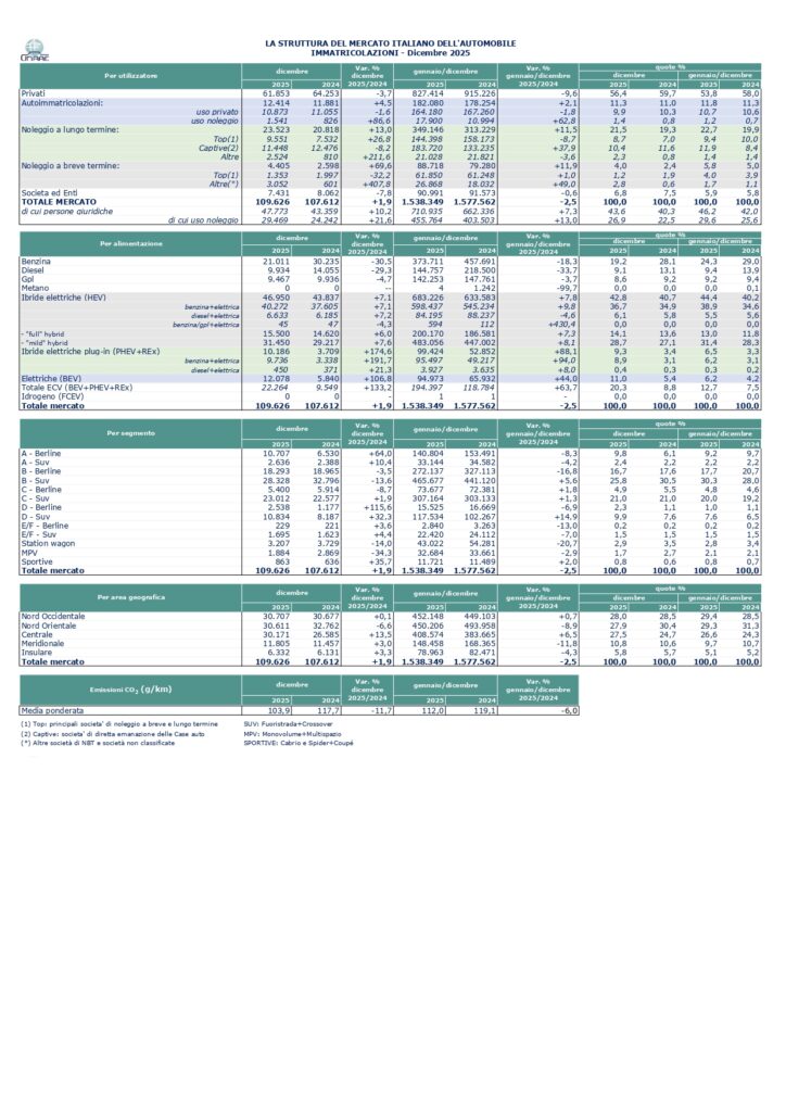Le emissioni medie di CO2 delle nuove immatricolazioni in dicembre cedono l’11,7% e scendono a 103,9 g/Km, e flettono del 6,0% nel totale 2025, a 112,0 g/Km. L’analisi delle immatricolazioni per fascia di CO2 riflette l’andamento nell’anno 2025 di auto BEV e PHEV: la fascia 0-20 g/Km rappresenta il 9,2% del mercato, il 3,1% la fascia 21-60 g/Km (rispettivamente 14,4% e 4,6% in dicembre). La fascia 61-135 g/Km rappresenta il 65,0% (59,1% in dicembre), mentre la quota delle vetture da 136 a 190 g/Km si porta al 18,5% e quella della fascia oltre i 190 g/Km al 2,1% (rispettivamente 16,8% e 2,2% nel mese di dicembre).