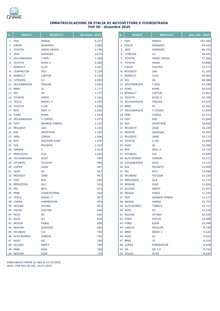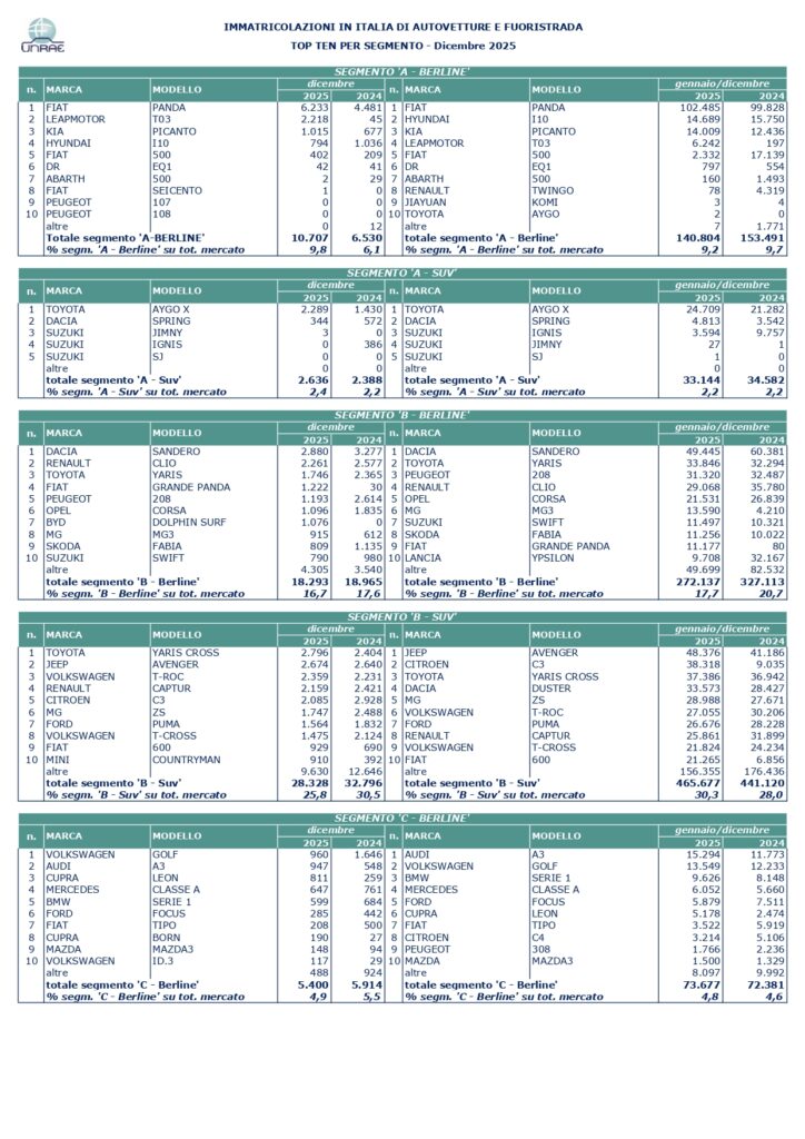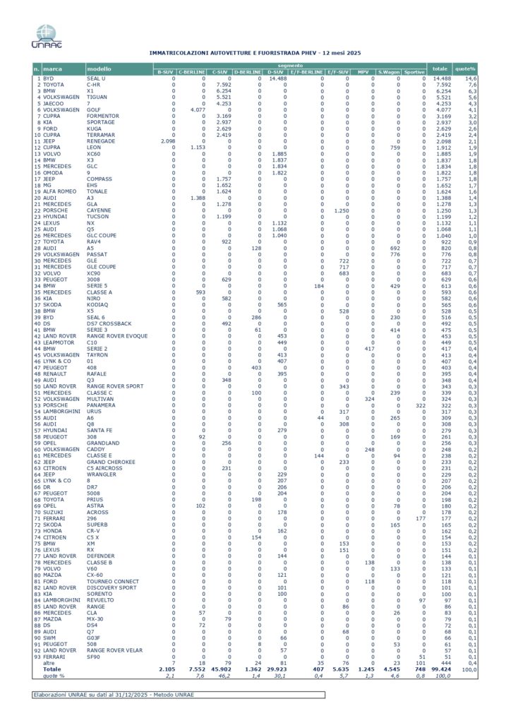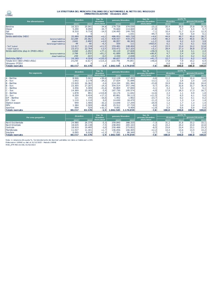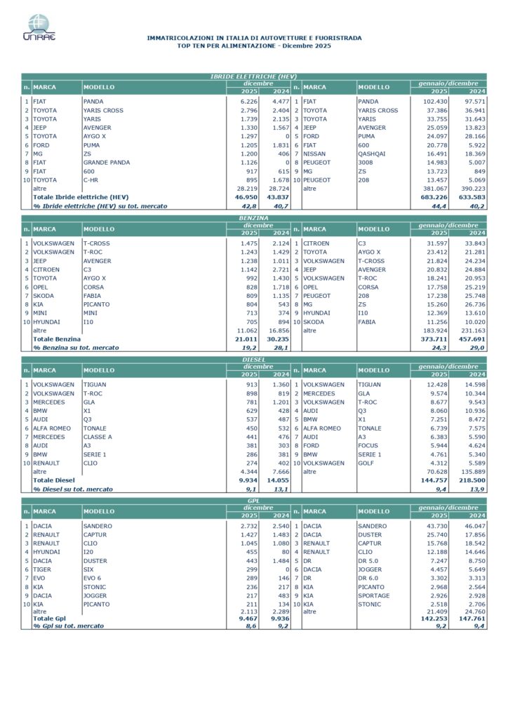 Tra le alimentazioni, il motore a benzina archivia il 2025 in forte flessione in volume e in quota: 24,3% di share (-4,7 punti), con oltre il 30% dei volumi persi nel mese di dicembre scendendo al 19,2% del totale (-8,9 p.p.). Il diesel retrocede al 9,4% di quota nell’intero 2025 (- 4,5 p.p.), con un dicembre in calo di 4 punti al 9,1%. Il Gpl chiude il 2025 al 9,2% (-0,2 p.p.), 8,6% in dicembre (-0,6 p.p.). Le ibride, regine del mercato, nell’intero anno guadagnano 4,2 punti e archiviano il 2025 al 44,4% di share (42,8% in dicembre), con un 13,0% per le “full” hybrid e 31,4% per le “mild” hybrid. Le auto BEV, come anticipato, chiudono l’anno 2025 al 6,2% di share, in crescita di 2 punti sul 2024 (11,0% nel solo dicembre, grazie all’immatricolazione di vetture incentivate), le PHEV salgono al 6,5% rispetto al 3,3% di un anno fa (9,3% in dicembre, +5,9 p.p.).