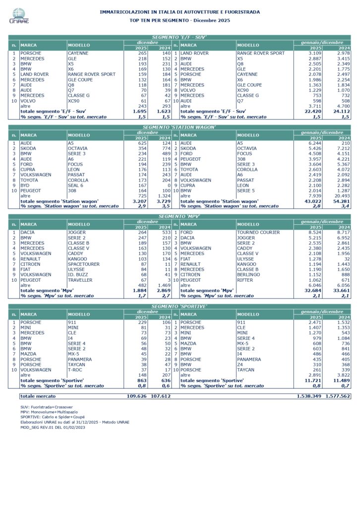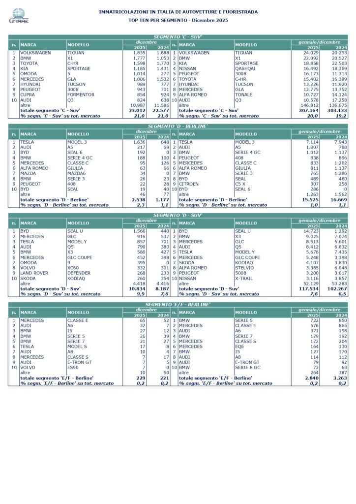 L’analisi della segmentazione mostra nell’intero 2025 una flessione delle berline e dei SUV del segmento A, rispettivamente al 9,2% e 2,2% di share. In forte contrazione le berline del segmento B, che scendono al 17,7%, mentre recuperano i Suv al 30,3%. Nel segmento delle medie (C) un lieve incremento interessa sia le berline, al 4,8% di quota, sia i Suv al 20,0%. Flettono le berline del segmento D, all’1,0%, in crescita i Suv al 7,6% del totale. Nell’alto di gamma cedono in volume sia le berline che i Suv, rispettivamente allo 0,2% e 1,5% di quota. Infine, le station wagon rappresentano il 2,8% del totale, gli MPV il 2,1% e le sportive lo 0,8%.