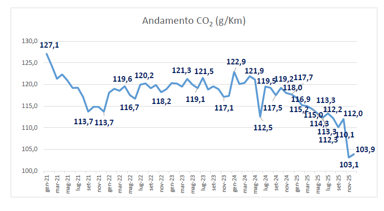 Gli incentivi del MASE hanno influenzato significativamente la quota di mercato delle vetture elettriche pure, che nell’ultimo mese ha raggiunto l’11,0% del totale con 12.078 unità complessive: un raddoppio rispetto al 5,4% di dicembre 2024, ma un lieve arretramento rispetto al 12,2% di novembre, anch’esso già influenzato dagli incentivi sulle auto “in pronta consegna”. Questo fenomeno ha ovviamente influenzato le emissioni di CO2, diminuite nel corso di dicembre di 13,8 g/Km (-11,7%). L’impatto degli incentivi proseguirà ancora per qualche mese, ma sussiste il rischio concreto che la domanda torni a fermarsi appena terminato questo effetto.