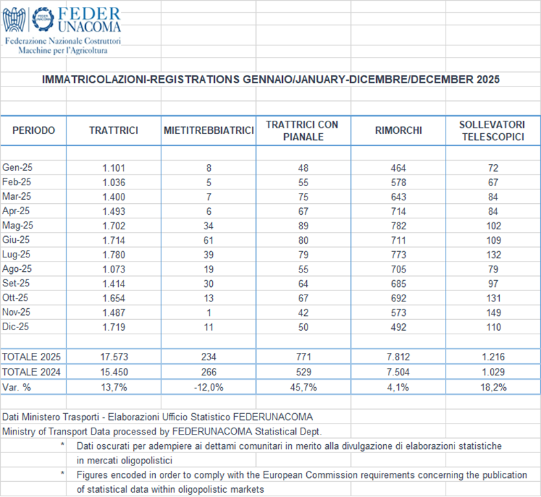 Positivo anche il risultato per i sollevatori telescopici, che chiudono con un attivo del 18,2% in ragione di 1.216 unità, mentre cresce con percentuali più contenute il mercato dei rimorchi, che conta 7.812 unità con un incremento di poco superiore al 4%. Unica categoria che mantiene un indice negativo è quella delle mietitrebbiatrici, che dopo i forti cali registrati in primavera e in estate riesce a contenere il passivo negli ultimi mesi dell’anno chiudendo con un decremento del 12% riferito a 234 unità immatricolate.