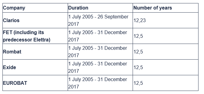 L’indagine della Commissione Europea è iniziata il 26 settembre 2017 a seguito di una domanda presentata da Johnson Controls International PLC, inclusa la sua controllata Clarios (ex JC Autobatterie), ai sensi della Comunicazione sulla clemenza della Commissione del 2006. Resonac (e la sua controllata FET) e Metair (e la sua controllata Rombat) hanno presentato domande di clemenza dopo che la Commissione aveva inviato richieste di informazioni.