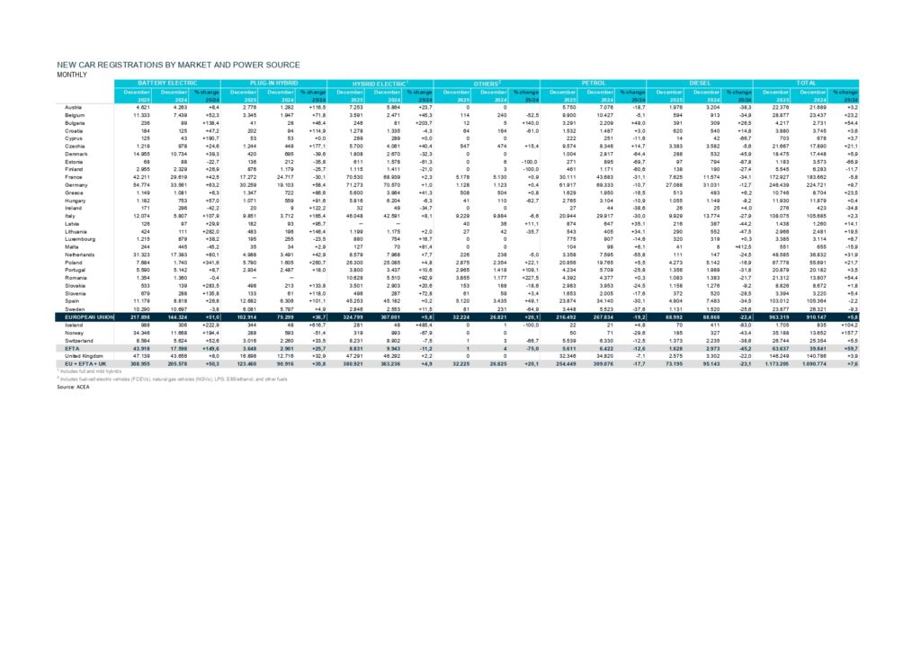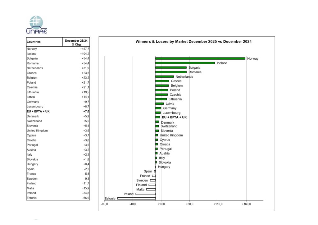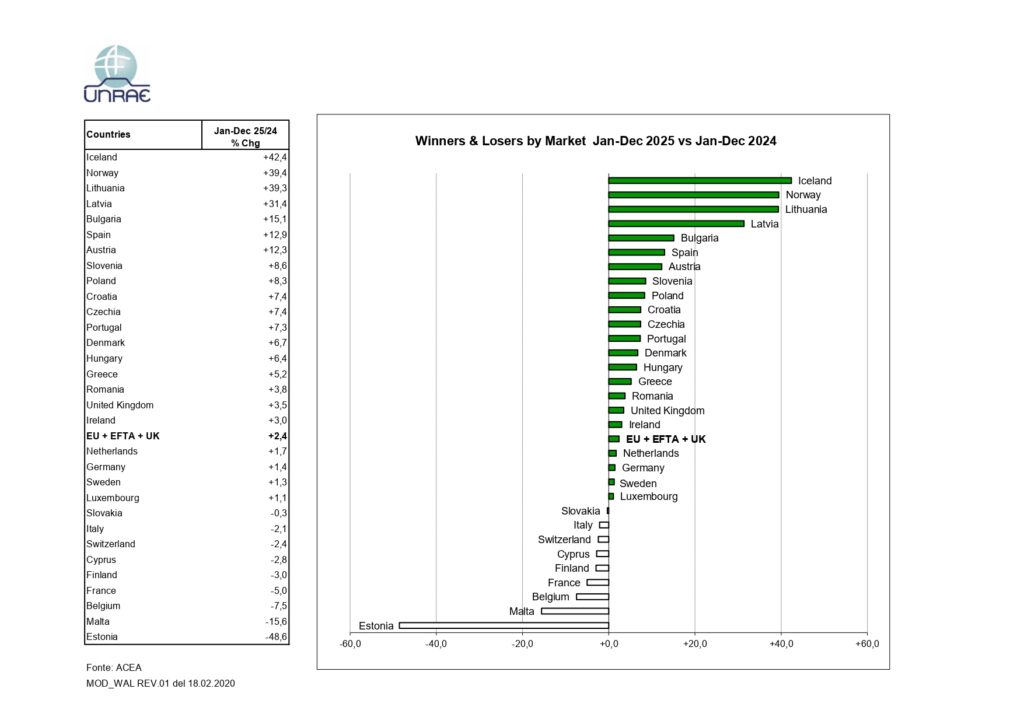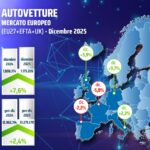Il mercato europeo delle autovetture archivia il 2025 con un bilancio leggermente positivo, registrando 13.271.270 nuove immatricolazioni, in aumento del 2,4% rispetto alle 12.962.714 del 2024. Nonostante il progresso, il mercato rimane ancora al di sotto del 16,0 % rispetto ai livelli pre-pandemia del 2019. Il mese di dicembre contribuisce positivamente alla performance annuale, totalizzando 1.173.205 immatricolazioni contro le 1.090.774 dello stesso periodo del 2024 (+7,6%).