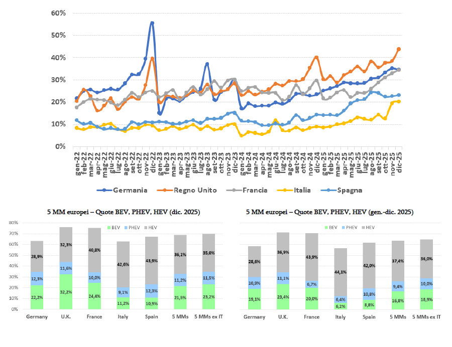 Complessivamente in Europa le ECV rappresentano il 36,8% di quota: BEV al 26,3% (+7,5 p.p.) e PHEV al 10,5% (+2,2 p.p.). Guardando l’intero 2025, lo scenario non cambia: l’Italia mantiene l’ultima posizione tra i cinque mercati principali con una quota ECV del 12,6% (BEV 6,2% e PHEV 6,4%), di fronte a: