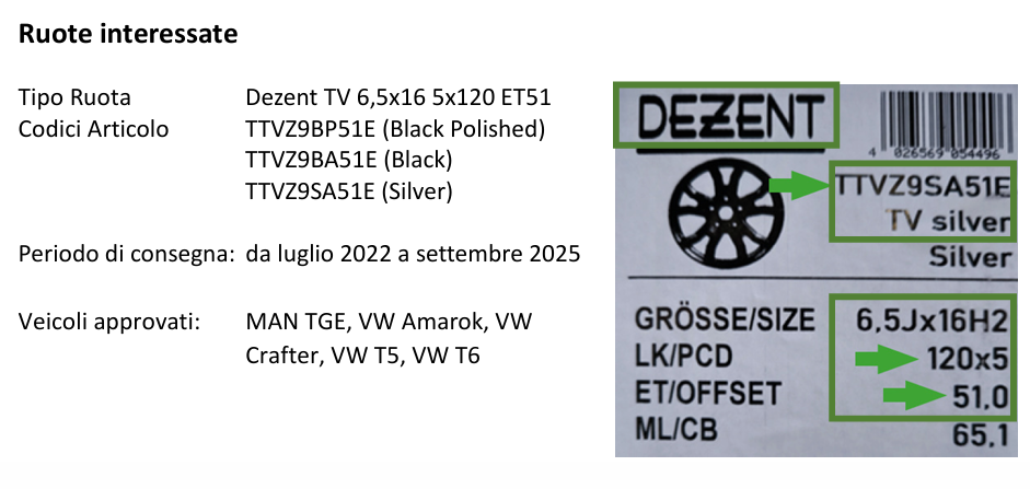 Il richiamo riguarda soltanto i codici articolo TTVZ9BP51E (Black Polished), TTVZ9BA51E (Black) e TTVZ9SA51E (Silver) del tipo TTVZ (KBA 54030/ECE R124 – 002038), Dezent TV 6,5×16 5×120 ET51 con il marchio di fabbrica «CO» e «MII». I cerchioni sono omologati per i veicoli MAN TGE, VW Amarok, VW Crafter, VW T5 e VW T6. Sono stati prodotti nel periodo compreso tra marzo 2022 e agosto 2025 e consegnati tra luglio 2022 e settembre 2025. I cerchioni in questione del tipo TTVZ sono identificabili dal marchio di fabbrica «CO» o «MII», sul retro del cerchione, ciò che permette di distinguerli dai cerchioni dello stesso tipo di un altro fabbricante. I marchi di fabbrica sono visibili solo quando le ruote sono smontate o su un ponte sollevatore.