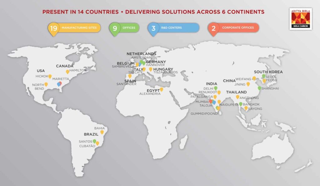 Birla Carbon opera in 14 paesi, con 19 stabilimenti produttivi e tre centri tecnologici all’avanguardia a Marietta, Georgia (USA), Taloja (India) e Sambreville (Belgio). La Strategia di Sostenibilità di Birla Carbon – Share the Future si concentra sui pilastri ESG di Ambiente, Sociale e Governance, con l’innovazione come motore per raggiungere i suoi obiettivi di sostenibilità.