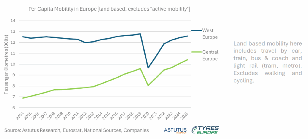 La mobilità terrestre europea (auto, treno, autobus, pullman e metropolitana leggera) si è in gran parte normalizzata dopo lo shock del Covid e, entro la fine del 2025, è tornata ai livelli pre-pandemici.