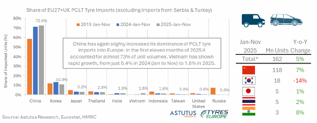 Le importazioni di pneumatici per autovetture e autocarri leggeri (PCLT) in Europa (UE27 più Regno Unito) sono aumentate del 5% nell’anno fino a novembre 2025, trainate principalmente da un balzo del 25% nel primo trimestre. Nel terzo trimestre, la crescita era rallentata all’1% e i volumi sono diminuiti del 10% nei primi due mesi del quarto trimestre. I grossisti hanno anticipato le spedizioni di pneumatici per autovetture cinesi in vista dei dazi UE previsti, che hanno rappresentato il 76% delle importazioni tra settembre e ottobre. La Corea è rimasta la seconda fonte principale, sebbene i volumi siano diminuiti del 14% negli undici mesi rispetto al 2024. L’India ha registrato una crescita superiore alla media e si è classificata al quinto posto, appena davanti al Vietnam, che ha registrato un aumento delle importazioni di oltre quattro volte in un solo anno.