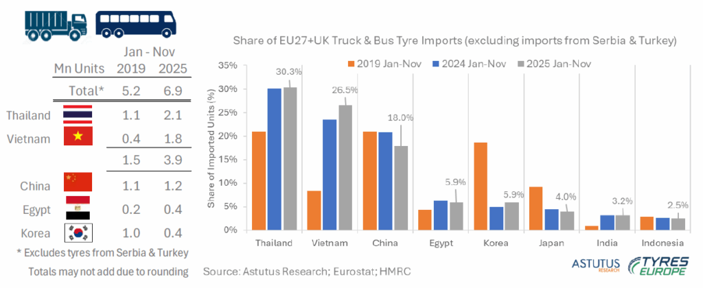 Le importazioni di pneumatici per autocarri e autobus (TBR) nell’UE27 + Regno Unito dai mercati extraeuropei sono aumentate di quasi il 10% nei primi undici mesi del 2025. Le spedizioni da Thailandia e Vietnam sono cresciute del 16% rispetto allo stesso periodo del 2024, portando la loro quota complessiva a quasi il 57%. La posizione della Cina si è indebolita, con volumi di importazione in calo di oltre il 5%. L’Egitto è rimasto il quarto principale fornitore, subito prima della Corea, sebbene le sue spedizioni siano cresciute solo del 4%, meno del mercato. Le importazioni coreane sono aumentate di quasi il 30% su base annua, ma rimangono inferiori di circa il 60% rispetto al 2019, quando il Paese deteneva una quota di quasi il 19%.