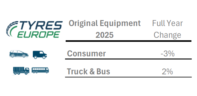 Dopo un forte calo l’anno precedente, la produzione europea di camion e autobus ha continuato a contrarsi all’inizio del 2025, per poi riprendersi più avanti nel corso dell’anno. Questa ripresa ha prodotto un modesto aumento annuo del 2% nei volumi di pneumatici di primo equipaggiamento per il segmento.