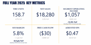 Goodyear Tire & Rubber Company ha presentato i risultati del quarto trimestre e dell’intero anno 2025. Il fatturato netto di Goodyear nel quarto trimestre 2025 è stato di 4,9 miliardi di dollari, con volumi pari a 42,3 milioni. Dopo aver rettificato l’impatto delle vendite delle attività di pneumatici Off-the-Road (OTR) e della divisione prodotti chimici per 227 milioni di dollari, il fatturato netto organico è aumentato del 4%.