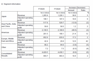 Di conseguenza, il fatturato del Gruppo nell’esercizio 2025 è stato di 4.429,5 miliardi di yen, con un calo dello 0,01% rispetto all’anno precedente; l’utile operativo rettificato è stato di 493,7 miliardi di yen, con un aumento del 2% rispetto all’anno precedente; l’utile operativo è stato di 381,2 miliardi di yen, con un calo del 14% rispetto all’anno precedente; l’utile ante imposte è stato di 354,7 miliardi di yen, con un calo del 16% rispetto all’anno precedente; e l’utile attribuibile agli azionisti della società madre è stato di 327,3 miliardi di yen, con un aumento del 15% rispetto all’anno precedente.