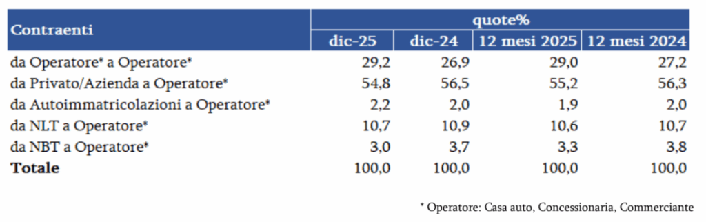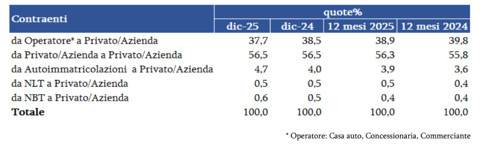 In dicembre i trasferimenti per contraente confermano l’andamento dei mesi precedenti: gli scambi tra privati/aziende, che rimangono largamente predominanti, sono stabili e rappresentano il 56,5% di tutti i passaggi di proprietà (56,3% nei 12 mesi). Parallelamente, 0,8 punti vengono persi da quelli da operatore a cliente finale, al 37,7% nel mese e 38,9% nel cumulato. Gli stessi sono penalizzati anche dagli scambi provenienti da auto-immatricolazioni che aumentano di 0,7 punti di quota (4,7% nel mese e 3,9% nel cumulato), mentre recuperano 0,1 punti quelli provenienti dal noleggio (1,1% complessivo nel mese e 0,9% nei 12 mesi).