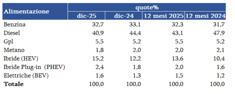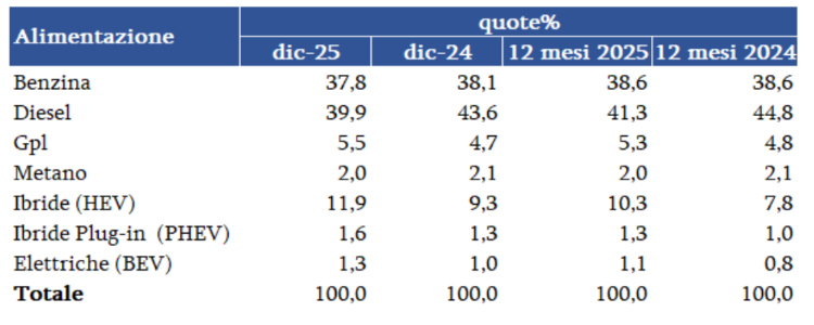 Fra le motorizzazioni il diesel nel mese conferma il 1° posto, al 39,9% di quota, seppur in calo di 3,7 p.p. (41,3% nel totale anno). Il motore a benzina, a distanza minima, si ferma al 37,8% (-0,3 p.p. e al 38,6% nel cumulato). Le ibride confermano una crescita sostenuta, toccando l’11,9% nel mese e il 10,3% in gennaio-dicembre; seguono Gpl e metano rispettivamente al 5,5% e 2,0% nel mese (5,3% e 2,0% nel cumulato); BEV e plug-in salgono all’1,3% e 1,6% in dicembre (1,1% e 1,3% nei 12 mesi).