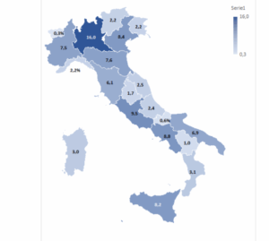 0,2 p.p.). In terza posizione troviamo la Campania con l’8,8% di quota (+0,1 p.p.) e al 4° posto il Veneto stabile all’8,4%, che scavalca la Sicilia all’8,2%.