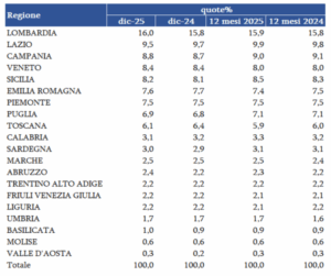 Nel mese di dicembre l’analisi per regione conferma invariato il podio: al primo posto la Lombardia, al 16,0% di quota (+0,2 p.p.) e al secondo il Lazio al 9,5% (-