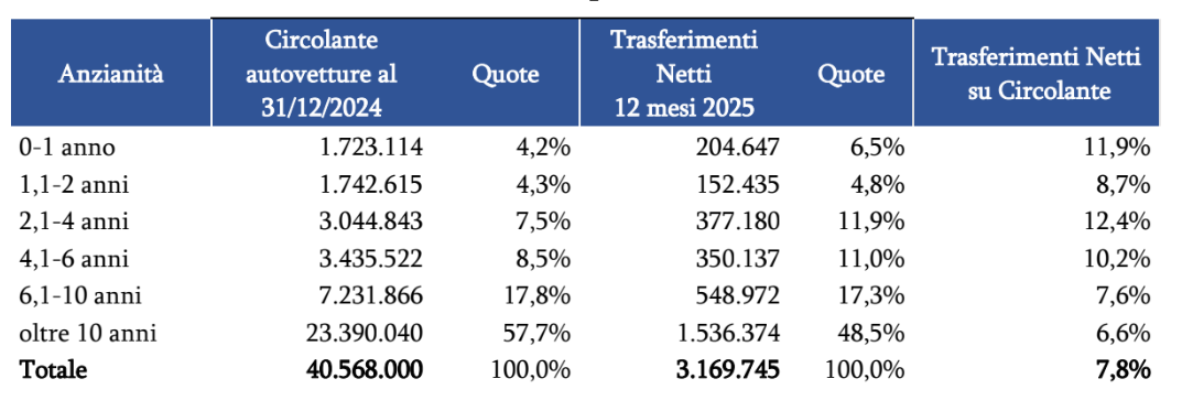In Italia al 31 dicembre 2024 circolavano oltre 40,5 milioni di auto, il 57,7% delle quali con un’anzianità superiore ai 10 anni. Nel complesso, per 100 auto circolanti a inizio 2025, nei nell’intero anno ne sono state acquistate 7,8 usate, mentre tale rapporto sale al 12,4% per la fascia da 2,1 a 4 anni e scende a 6,6 per quella con anzianità superiore ai 10 anni.