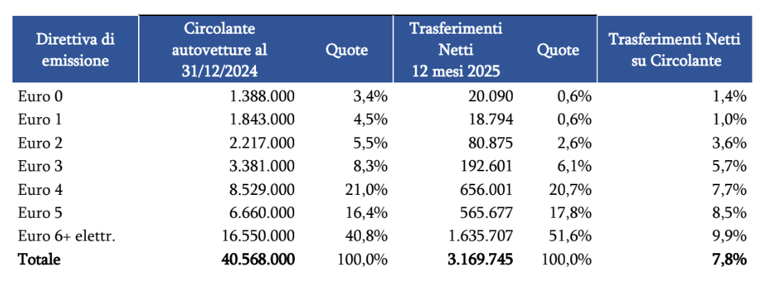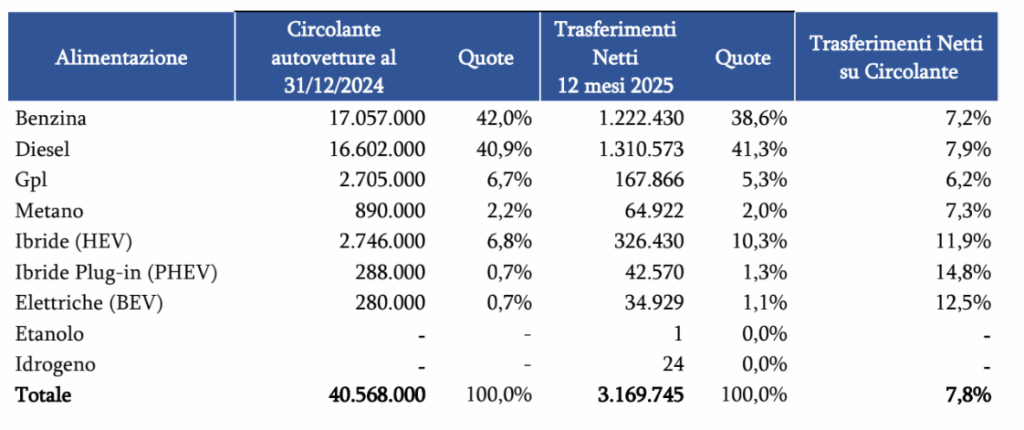 Il 42,0% delle auto circolanti al 31 dicembre 2024 era composto da auto a benzina, leggermente superiore al 40,9% di auto diesel. A fronte di ciò, nell’anno 2025 i trasferimenti di auto a benzina sono stati il 38,6% del totale e quelli di auto diesel il 41,3%. I trasferimenti di vetture ibride coprono una quota del 10,3% a fronte di una share del 6,7% sul circolante al 31 dicembre 2024.