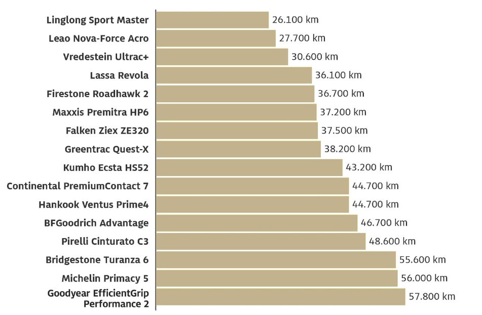 Per una comprensione migliore di questo commento, si sottolinea che il migliore in questa disciplina – l’EfficientGrip Performance 2 di Goodyear – aveva più del doppio del chilometraggio (57.800 chilometri).
