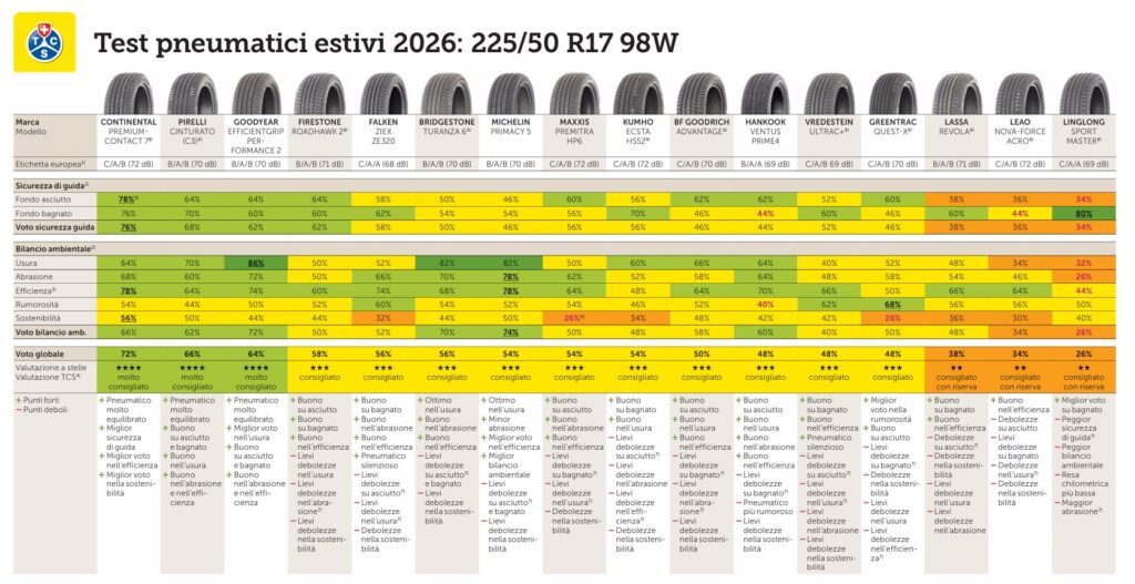 Quest’anno il reparto Test & Tecnica del Touring Club Svizzera, in collaborazione con ADAC, ha testato 16 pneumatici estivi nella dimensione 225/50 R17 98W/Y. I pneumatici estivi testati sono suddivisi in 6 premium, 5 quality e 5 budget. I prodotti sono stati valutati in base a 15 diversi criteri di prova relativi alla sicurezza di guida e all’impatto ambientale.