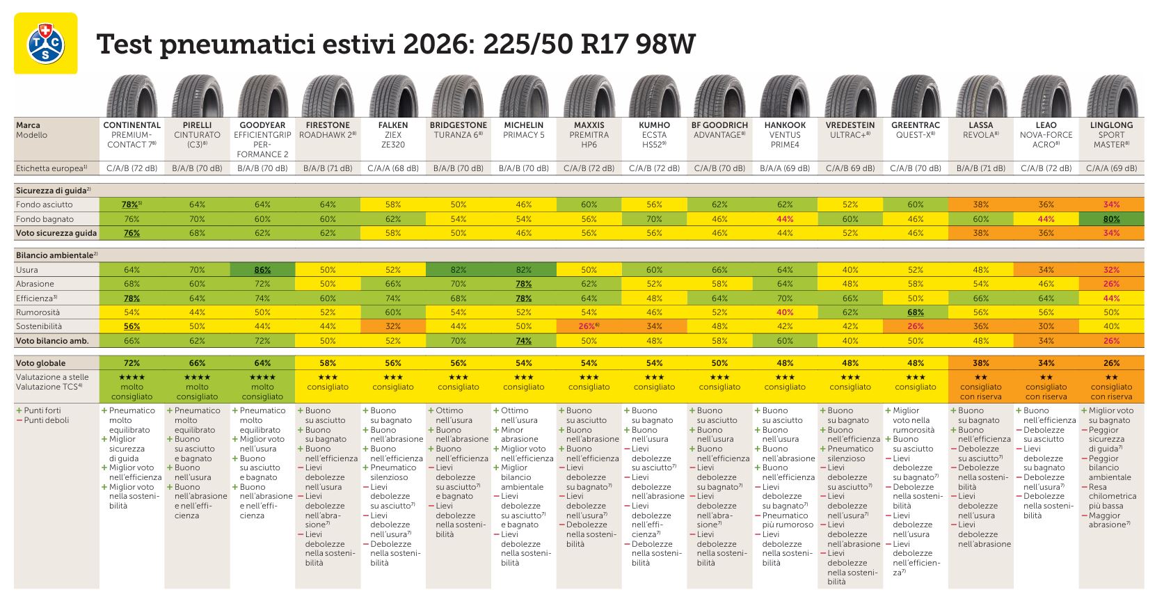 Punti di debolezza: Lievi debolezze su asciutto e usura, che hanno portato al declassamento; debolezze nella sostenibilità