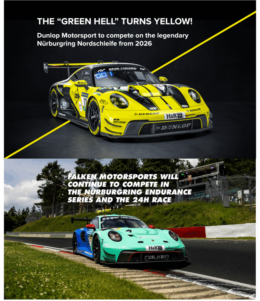 Era da qualche mese che si parlava di come si sarebbe presentato il Gruppo Sumitomo Rubber Industries alla 24 ore del Nürburgring 2026 e alla NLS. Ora, è arrivata l’ufficialità: l’azienda giapponese schiererà entrambi i marchi Falken e Dunlop, portando in griglia una Porsche turchese e una gialla.