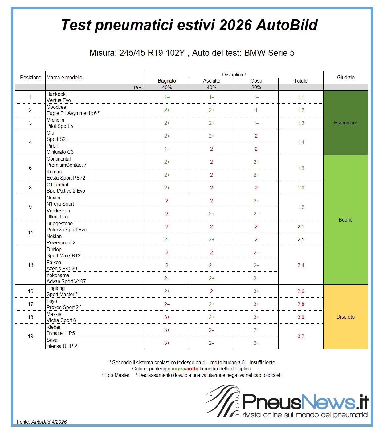 Il Ventus Evo di Hankook si è aggiudicato il primo posto, classificandosi secondo nel test di frenata. AutoBild descrive il pneumatico come uno “specialista della dinamica di guida con un’eccellente maneggevolezza sia su asciutto che su bagnato”, vantando gli spazi di frenata sull’asciutto più brevi e un buon rapporto qualità-prezzo. Nel rapporto di prova non sono stati rilevati punti deboli. A solo un decimo di punto di distanza, il Goodyear Eagle F1 Asymmetry 6 ha tagliato il traguardo al secondo posto, criticato solo per essere “leggermente più costoso“, nonostante abbia comunque offerto prestazioni di alto livello in tutte le discipline di guida. Inoltre, data la sua percorrenza prevista di oltre 63.800 chilometri – la più alta tra tutti i pneumatici testati – gli è stato conferito il titolo di “Eco-Master”.