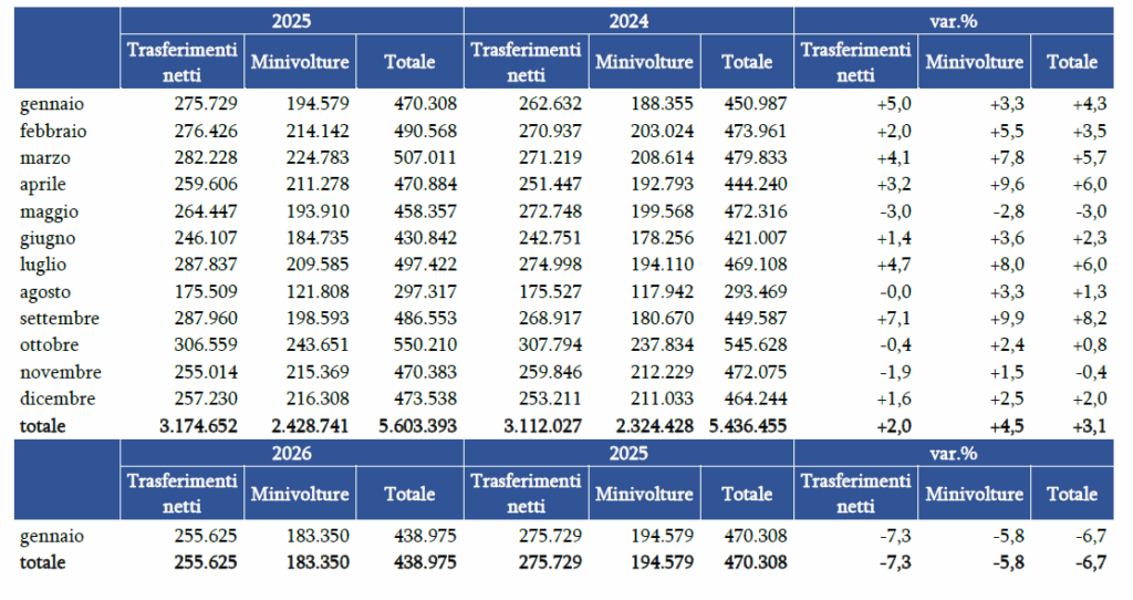 Il 2026 si apre con un segno meno per il mercato dell’auto usata: con 438.975 trasferimenti di proprietà (dati in attesa di consolidamento), il mese di gennaio registra un -6,7% rispetto ai 470.308 di gennaio 2025 (-9,9% sul 2019), il calo più forte da 40 mesi a questa parte. I trasferimenti netti calano del 7,3%, mentre le minivolture segnano un -5,8%.