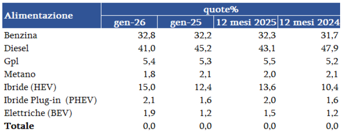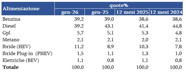 Fra le motorizzazioni, nel mese il diesel e benzina condividono il 1° posto sul podio, al 39,2% di quota; il primo perde 3,9 punti, mentre la benzina recupera 0,2 p.p. Le ibride confermano una crescita sostenuta, toccando l’11,2% nel mese; seguono Gpl e metano rispettivamente al 5,7% e 2,1% nel mese; BEV e plug-in salgono all’1,1% e 1,5% in gennaio