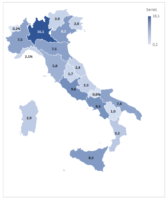 Nel mese di gennaio l’analisi per regione conferma invariato il podio: al primo posto la Lombardia, al 16,1% di quota (+0,5 p.p.) e al secondo il Lazio al 9,6% (-0,2 p.p.). In terza posizione troviamo la Campania con il 9,3% di quota (-0,1 p.p.) e al 4° posto torna la Sicilia, stabile all’8,3%, seguita dal Veneto all’8,2%.