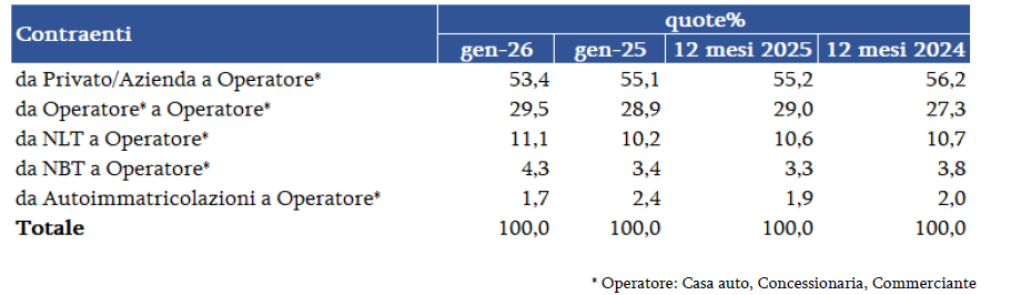 In gennaio i trasferimenti per contraente confermano l’andamento dei mesi precedenti: gli scambi tra privati/aziende, che rimangono largamente predominanti, sono in leggera crescita e rappresentano il 57,6% di tutti i passaggi di proprietà. Parallelamente, 1,1 punti vengono persi da quelli da operatore a cliente finale, al 37,7% nel mese. Gli stessi sono penalizzati anche dagli scambi provenienti da auto-immatricolazioni che aumentano di 0,5 punti di quota (3,9% nel mese), mentre recuperano 0,1 punti quelli provenienti dal noleggio (0,9% complessivo nel mese).
