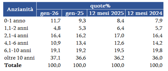 Anche fra le minivolture recupera la quota delle autovetture con più di 10 anni, al 37,1% del totale: 0,5 punti in più di gennaio 2025. Cede 0,1 punti la fascia da 6 a 10 anni (al 19,1%) e perde 2,5 punti quella da 4 a 6 anni, al 10,9%. Recupera 0,2 punti la fascia da 2 a 4 anni (al 16,4%); quella da 1 a 2 anni scende al 4,8% (-0,5 p.p.), mentre recupera 2,4 punti quella fino a 1 anno, all’11,7%. Nel complesso, le minivolture di vetture fino a 4 anni di anzianità coprono il 32,9% a gennaio, 2,1 punti in più dello stesso mese 2025.