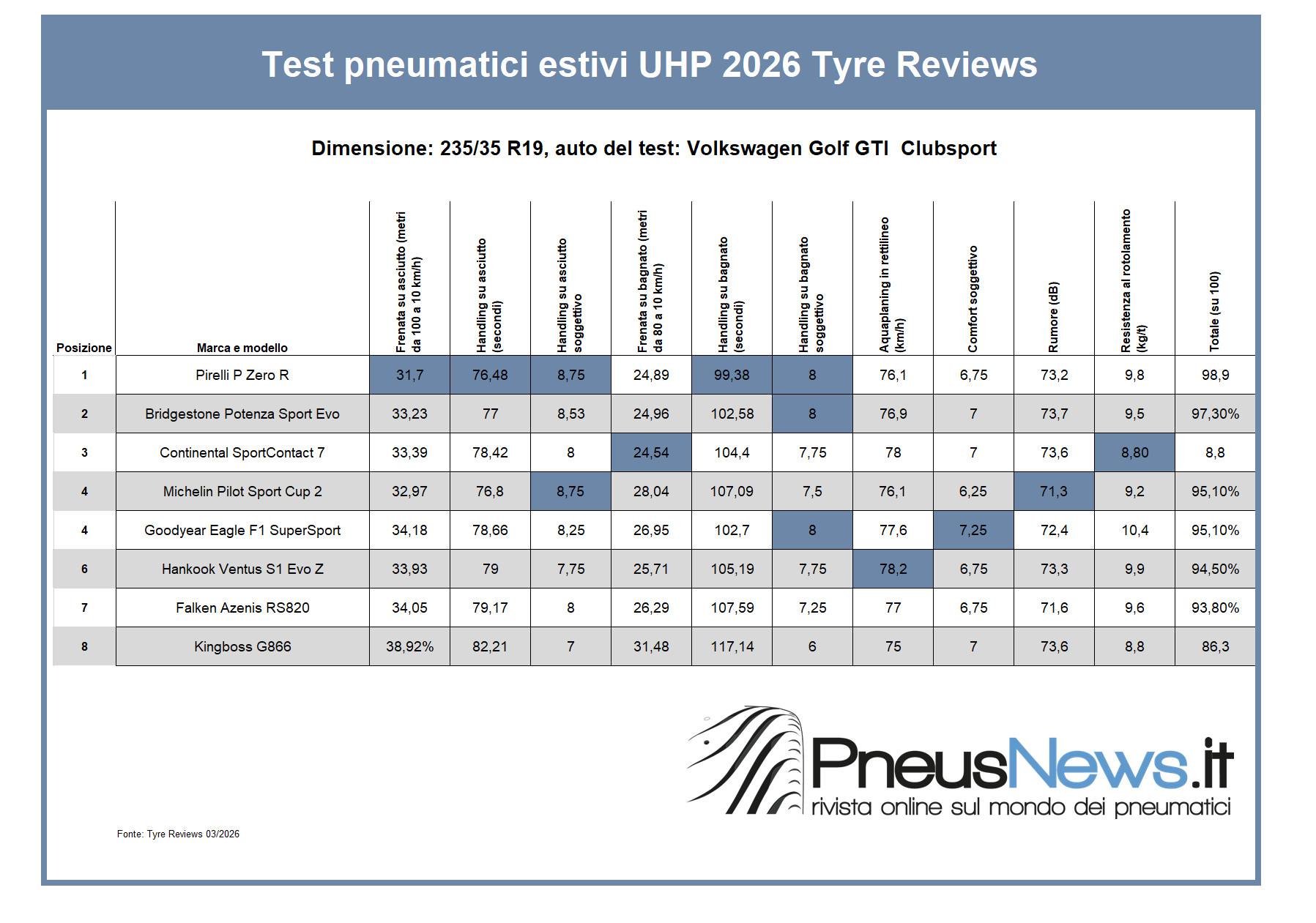 Tyre Reviews ha pubblicato un altro test estivo, questa volta sui pneumatici sportivi in misura 235/35 R19, utilizzando come auto di prova una VW Golf 8 GTI ClubSport. I partecipanti erano, in ordine alfabetico, Bridgestone Potenza Sport Evo, Continental SportContact 7, Falken Azenis RS820, Goodyear Eagle F1 SuperSport, Hankook Ventus S1 Evo Z, Kingboss G866, Michelin Pilot Sport Cup 2 e Pirelli P Zero R. Ecco la classifica.