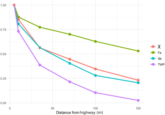 - Calo esponenziale: La concentrazione diminuisce drasticamente allontanandosi dalla carreggiata. Tuttavia, tracce significative di inquinanti legati ai pneumatici sono rilevabili anche a distanze superiori a quelle ipotizzate in precedenza.