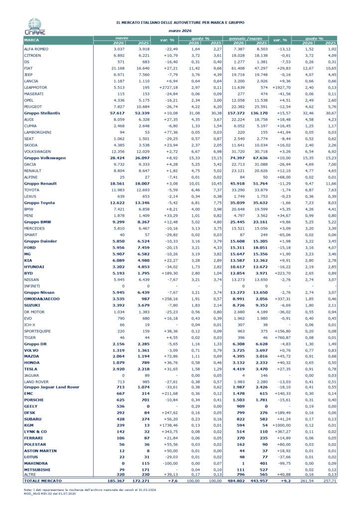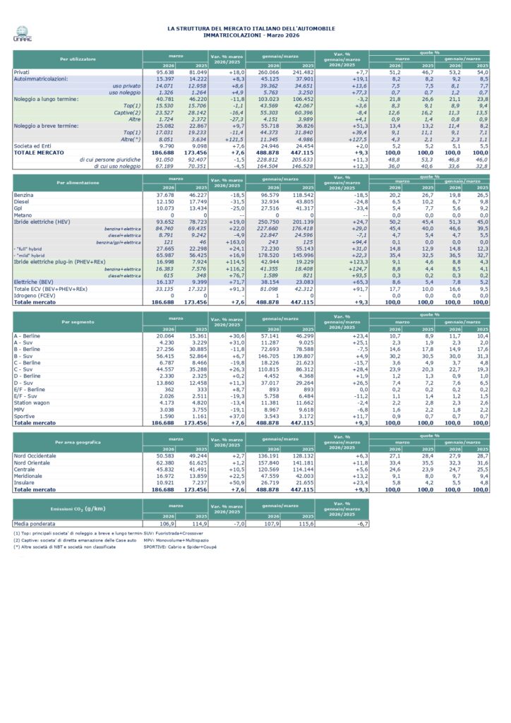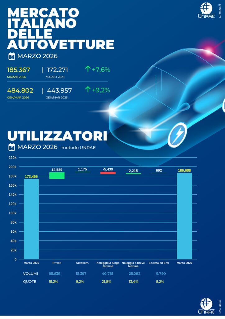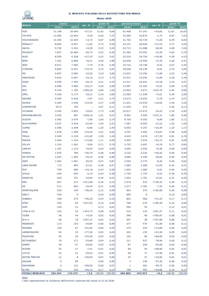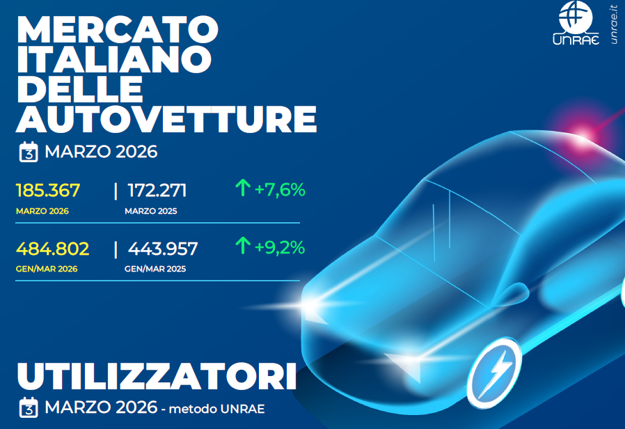 Il mercato autovetture italiano conferma la sua fase espansiva e nel mese di marzo totalizza 185.367 nuove immatricolazioni, un incremento del 7,6% rispetto alle 172.271 unità registrate nello stesso mese del 2025; il primo trimestre raggiunge così 484.802 vetture, pari a una crescita del 9,2% sul periodo gennaio-marzo dello scorso anno, pur rimanendo ancora distante dai livelli pre-pandemia del 2019 (-10%).