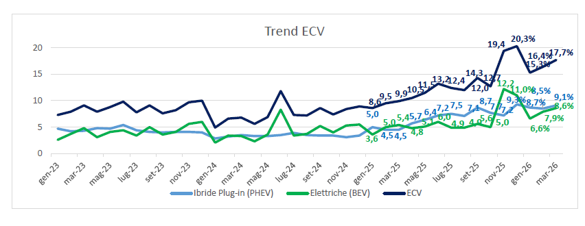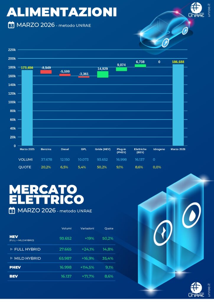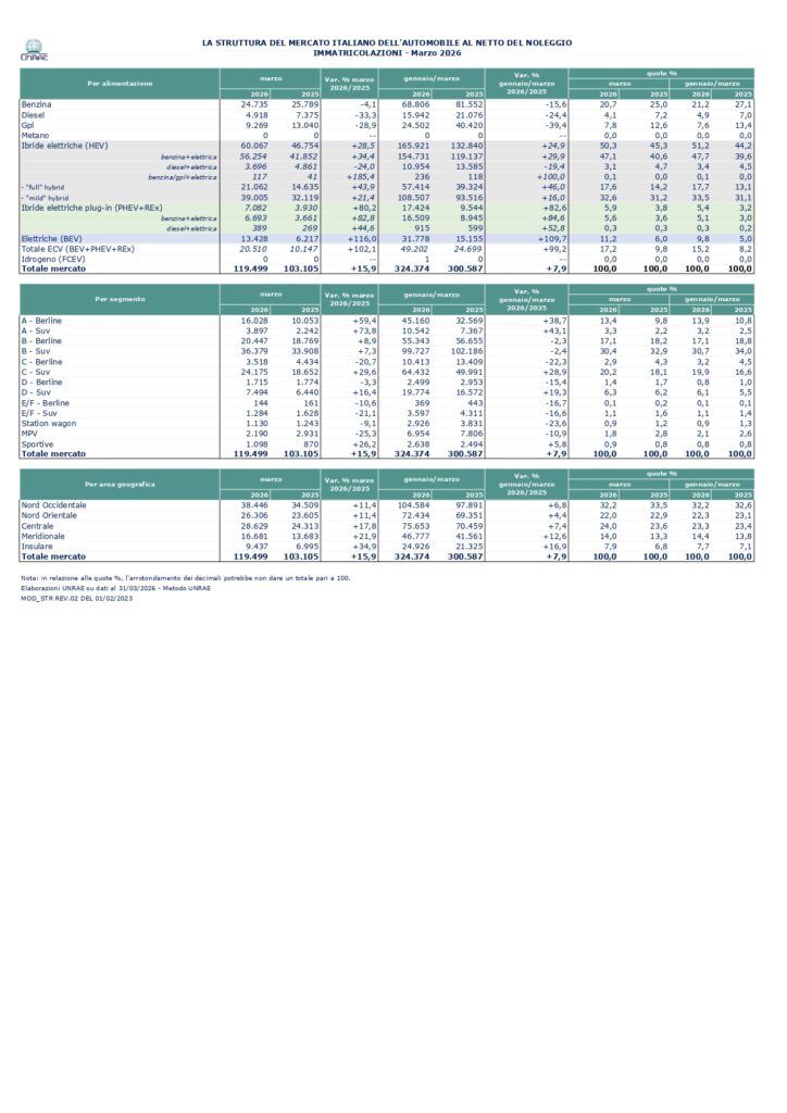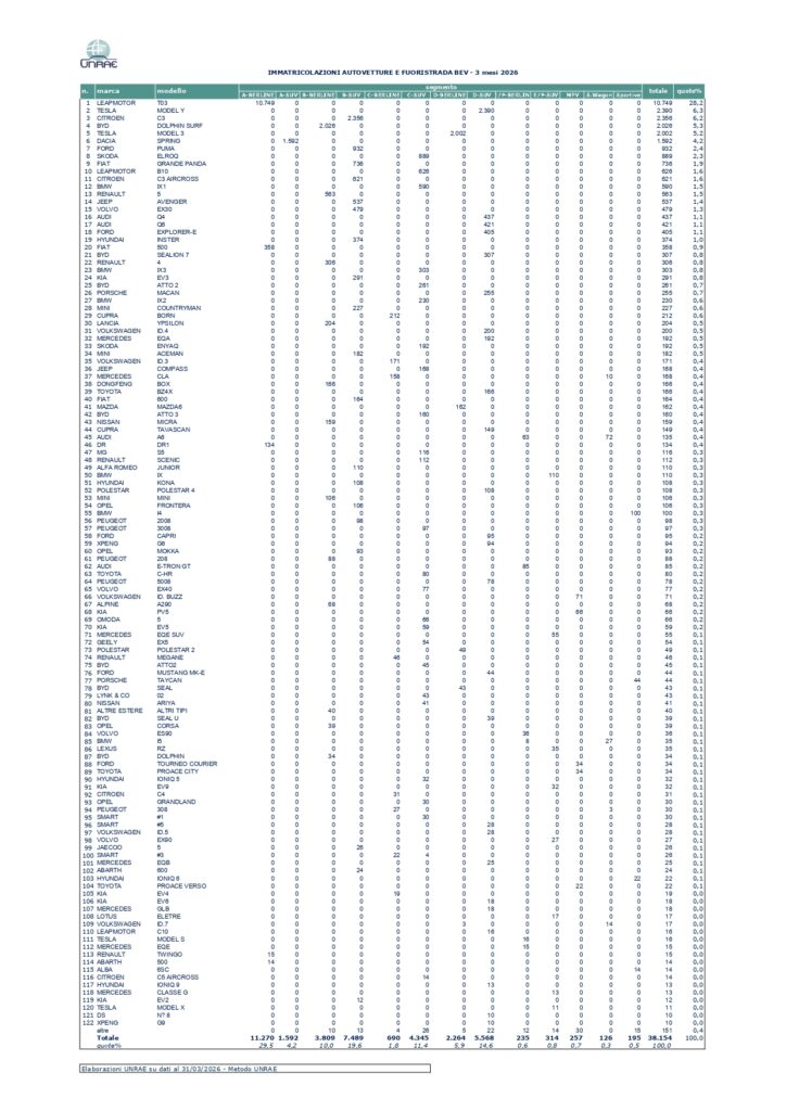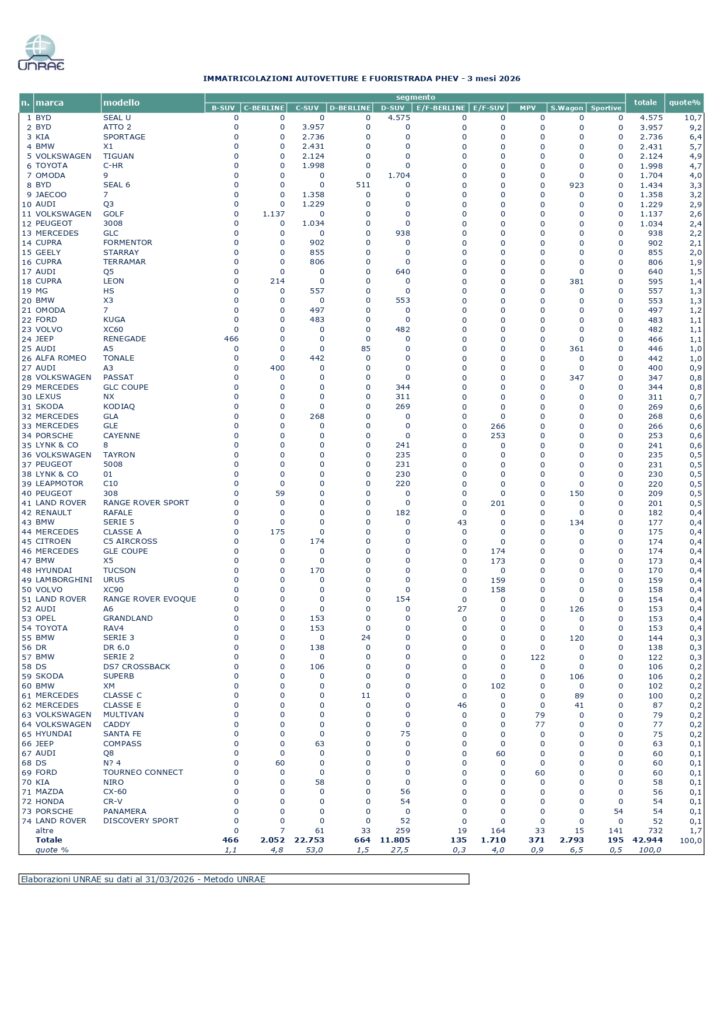 La quota delle vetture elettriche pure sale all’8,6% con 16.137 immatricolazioni (con 1/3 del totale concentrato su un solo brand), un valore nettamente superiore al 5,4% di marzo 2025 e in aumento anche rispetto al 7,9% registrato a febbraio; le ibride plug-in confermano un andamento vivace, sostenuto dall’ampliamento dell’offerta e dalle regole sui fringe benefit aziendali, raggiungendo il 9,1% contro il 4,6% di un anno fa e l’8,5% del mese precedente.