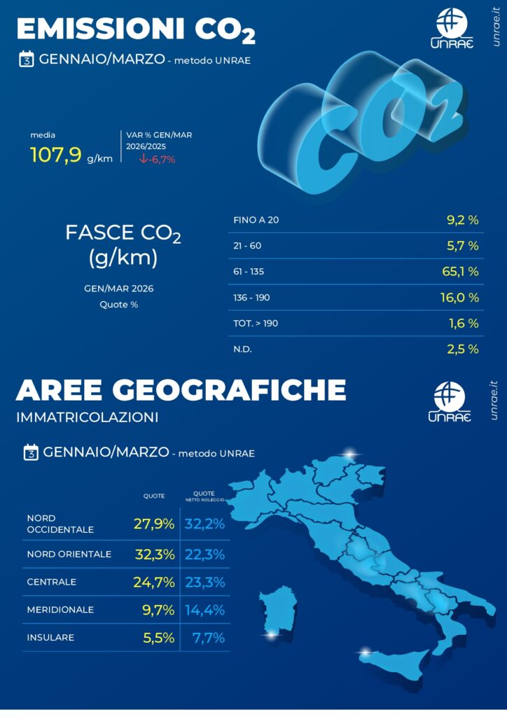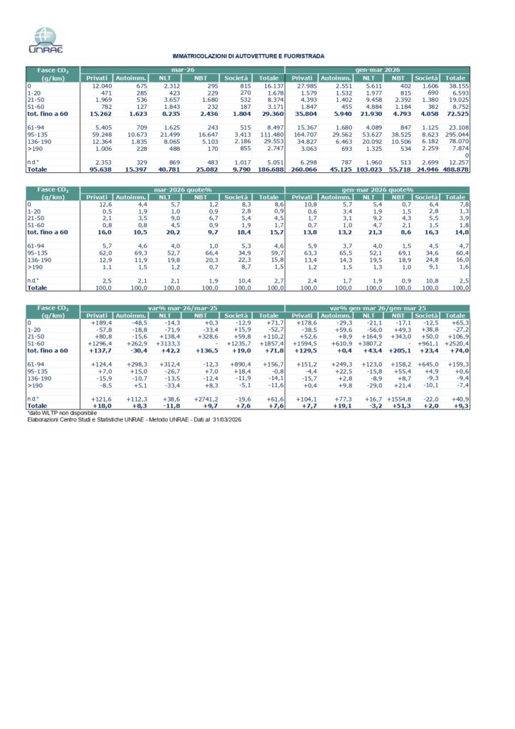 Le emissioni medie di CO2 delle nuove immatricolazioni in marzo cedono il 7,0% e scendono a 106,9 g/Km; nel 1° trimestre flettono del 6,7%, a 107,9 g/Km. L’analisi delle immatricolazioni per fascia di CO2 riflette l’andamento in marzo di auto BEV e PHEV: la fascia delle ZEV (0 g/Km) rappresenta l’8,6% del mercato, lo 0,9% la fascia 1-20 g/Km (rispettivamente 7,8% e 1,3% nel trimestre). La fascia 21-50 g/Km pesa il 4,5% del totale e la 51-60 g/Km l’1,7% (nei primi 3 mesi rispettivamente il 3,9% e l’1,8%). La 61-94 g/Km rappresenta il 4,6% (4,7% nel cumulato), la 95-135 g/Km il 59,7% (60,4% in gennaio-marzo), mentre la quota delle vetture da 136 a 190 g/Km si porta al 15,8% e quella della fascia oltre i 190 g/Km all’1,5% (rispettivamente 16,0% e 1,6% nel cumulato).