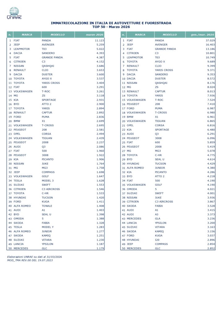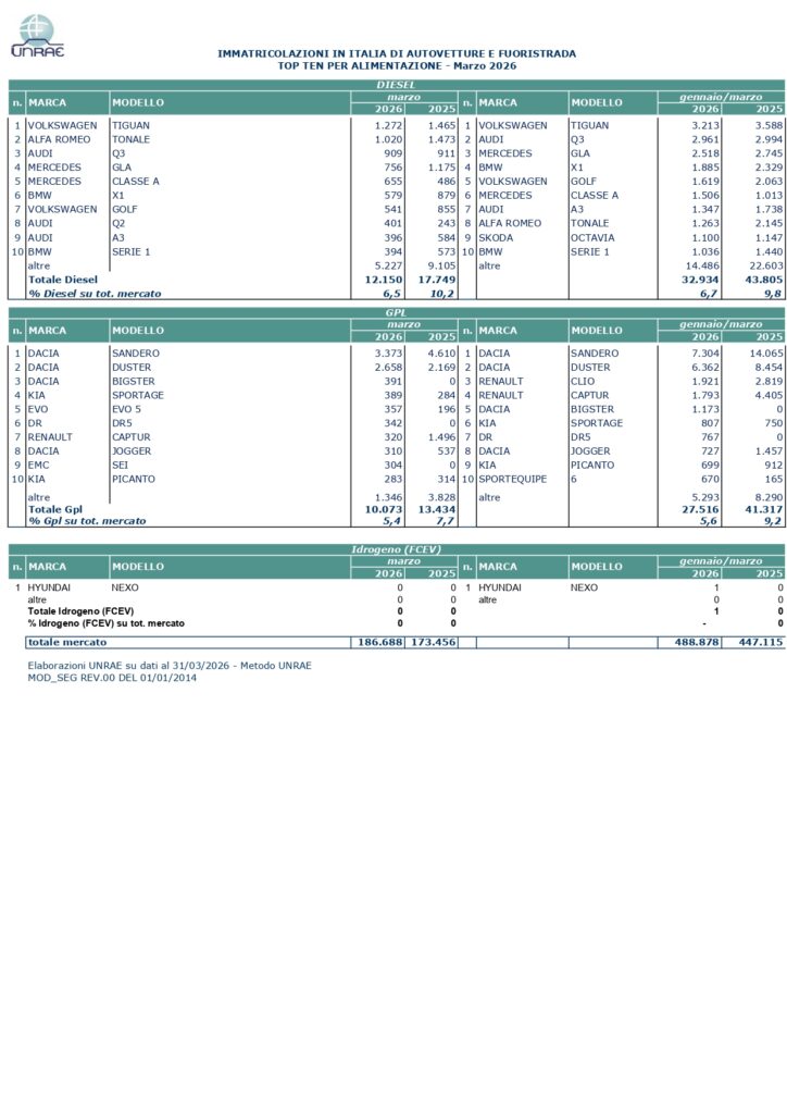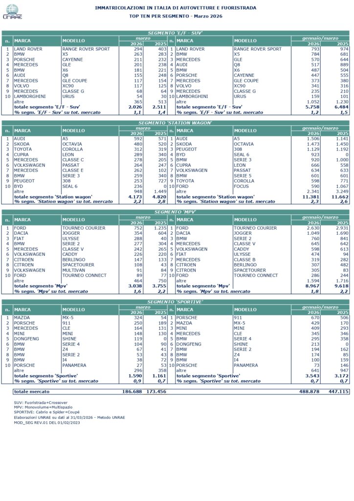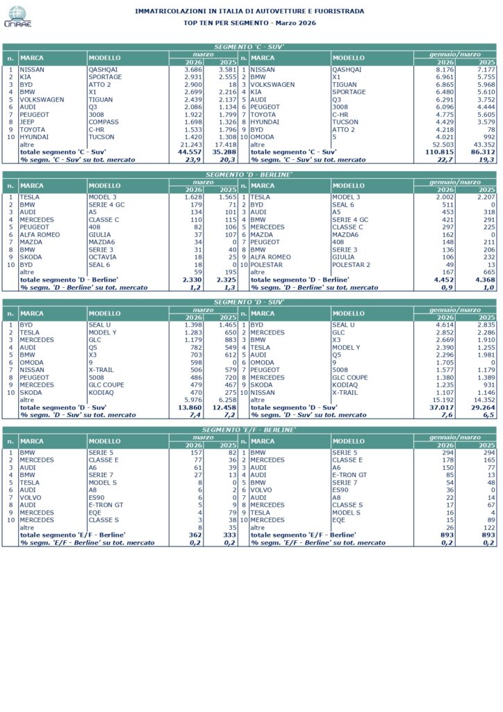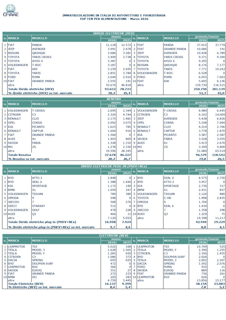 Tra le alimentazioni, il motore a benzina nel mese perde 6,5 punti, scendendo al 20,2% di share (19,8% nel cumulato, -6,7 p.p.). Il diesel perde quasi 1/3 dei volumi e retrocede al 6,5% di quota nel mese (-3,7 p.p.) e al 6,7% nel trimestre (-3,1 p.p.). Il Gpl in marzo perde 2,3 punti di quota, al 5,4%, e scende al 5,6% in gennaio-marzo (-3,6 p.p.). Le ibride, regine del mercato, anche in marzo segnano una forte accelerazione, guadagnano 4,8 punti al 50,2% di share (51,3% nel 1° trimestre), con un 14,8% per le “full” hybrid e 35,4% per le “mild” hybrid. Le auto BEV, come anticipato, chiudono il mese di marzo all’8,6% di share, in crescita di 3,2 punti sul 2025 (7,8% nel cumulato); le PHEV salgono al 9,1% rispetto al 4,6% di un anno fa (8,8% in gennaio-marzo, +4,5 p.p.).