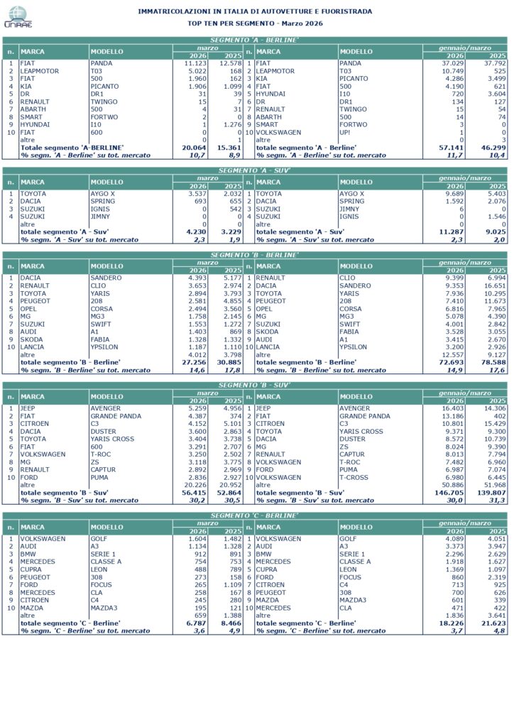 L’analisi della segmentazione mostra in marzo una crescita di quasi 1/3 dei volumi delle berline e dei SUV del segmento A, rispettivamente al 10,7% e 2,3% di share. In contrazione le berline del segmento B, che scendono al 14,6%, mentre recuperano i Suv al 30,2%. Nel segmento delle medie (C) in calo le berline, al 3,6% di quota, mentre un’ottima crescita interessa i Suv al 23,9%. Stabili le berline del segmento D, all’1,2%, in sostenuta crescita i Suv al 7,4% del totale. Nell’alto di gamma crescono in volume le berline mentre retrocedono i Suv, rispettivamente allo 0,2% e 1,1% di quota. Infine, le station wagon rappresentano il 2,2% del totale, gli MPV l’1,6% e le sportive lo 0,9%.