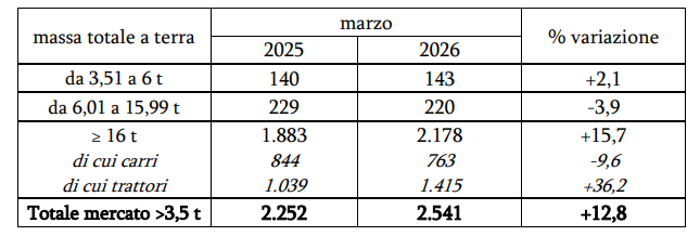 Il mercato dei veicoli industriali registra una crescita del 12,8% a marzo, con 2.541 immatricolazioni rispetto alle 2.252 registrate nello stesso mese del 2025. Il segmento dei veicoli pesanti, con massa pari o superiore a 16 t, evidenzia un andamento positivo, segnando un +15,7% su base mensile – trainato soprattutto dai trattori (+36,2%) – a fronte di un calo dei carri del 9,6%. In aumento anche la fascia dei veicoli leggeri fino a 6 t (+2,1%), mentre i mezzi con massa compresa tra 6,01 e 15,99 t flettono del 3,9%.