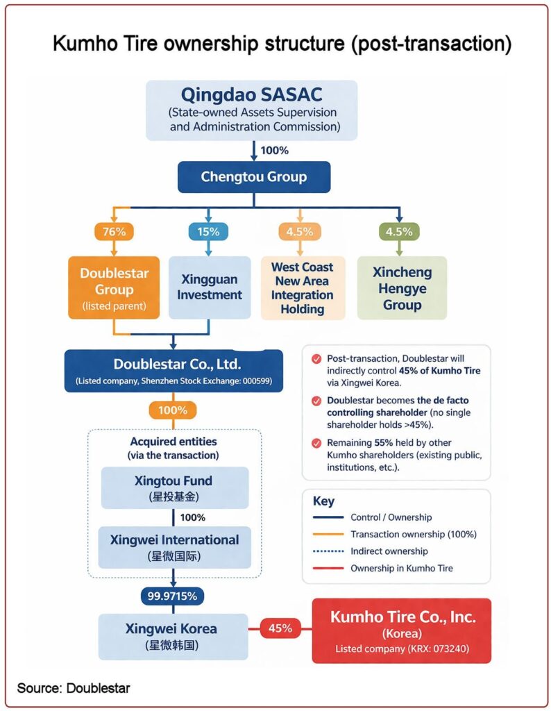 L’operazione si concentra sull’acquisizione da parte di Doublestar della piena proprietà di due veicoli di investimento intermedi, Xingtou Fund e Xingwei International, che insieme si trovano al vertice della catena di proprietà che conduce a Kumho Tire. Xingwei International controlla Xingwei Korea, che a sua volta detiene circa il 45% del capitale azionario di Kumho Tire.