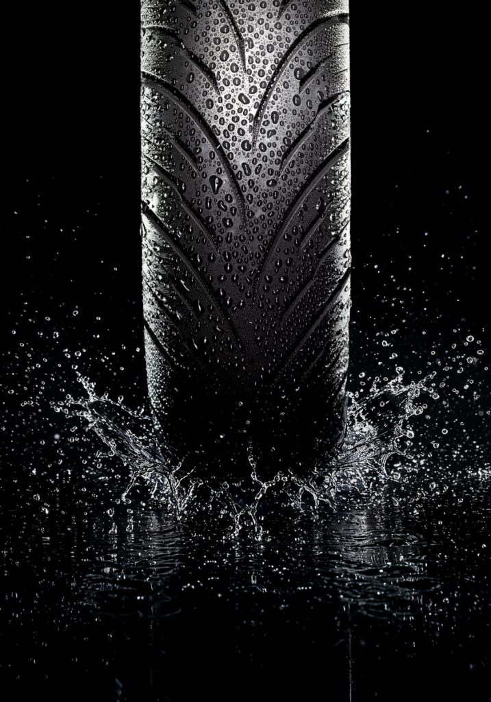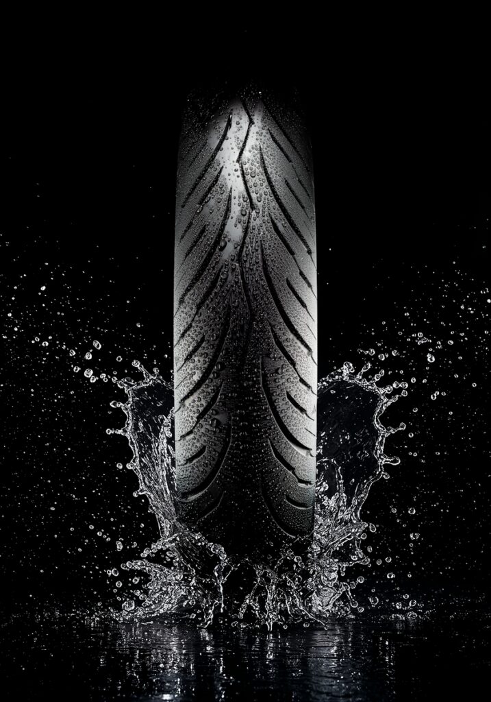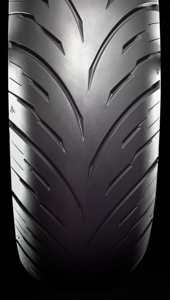 Il tutto è completato da un nuovissimo disegno del battistrada. Il pneumatico anteriore presenta una scanalatura centrale frastagliata per rompere l’acqua in superficie e ridurre gli spazi di frenata, mentre l’orientamento delle scanalature principali migliora la dispersione dell’acqua a velocità intermedie. Le scanalature secondarie e gli elementi della spalla del battistrada migliorano ulteriormente l’aderenza nelle manovre su superfici scivolose.
