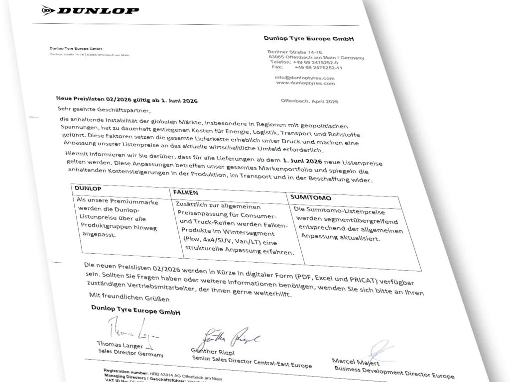 In una lettera ai clienti, Dunlop Tyre Europe annuncia i nuovi listini prezzi per i pneumatici dei suoi marchi; i nuovi prezzi di listino saranno in vigore dal 1° giugno. Come spiega l’azienda nella lettera, la persistente instabilità dei mercati globali, in particolare nelle regioni con tensioni geopolitiche, ha “portato a un aumento permanente dei costi per energia, logistica, trasporto e materie prime. Questi fattori stanno esercitando una notevole pressione sull’intera catena di approvvigionamento e rendono necessario un adeguamento dei nostri prezzi di listino all’attuale contesto economico.”
