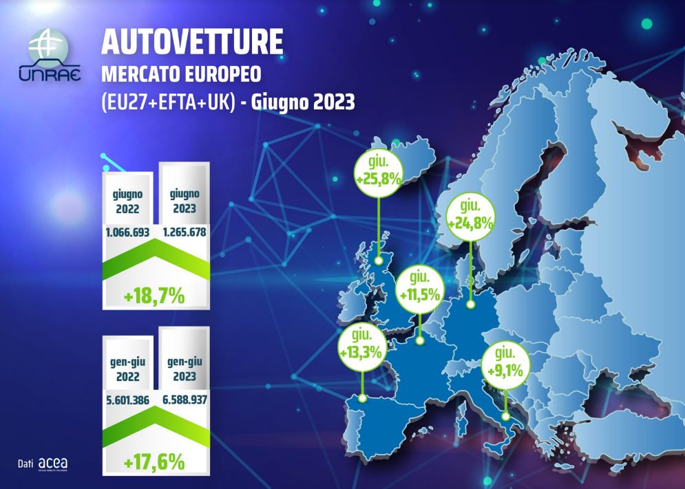 Mercato dell’auto a gonfie vele in Europa anche nel mese di giugno, undicesima crescita mensile consecutiva con 1.265.678 immatricolazioni, +18,7% …