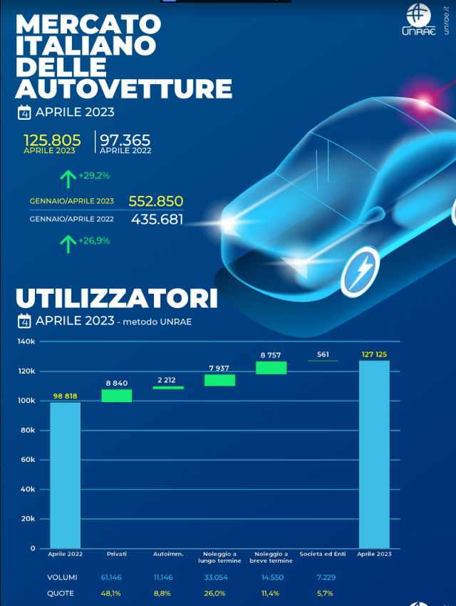 Nuova forte accelerazione delle immatricolazioni di autovetture nel mese di aprile, con 125.805 nuove registrazioni e una crescita del 29,2% …