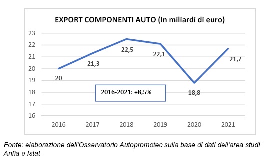 Nel 2021 il valore delle esportazioni di componenti automotive dall’Italia è stato pari a 21,7 miliardi di euro, in aumento …