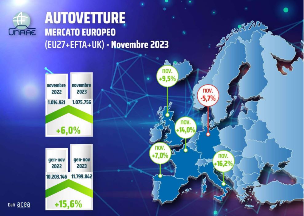 Mercato auto Europa: a novembre +6%, 16 mesi in crescita, ma inizia un rallentamento