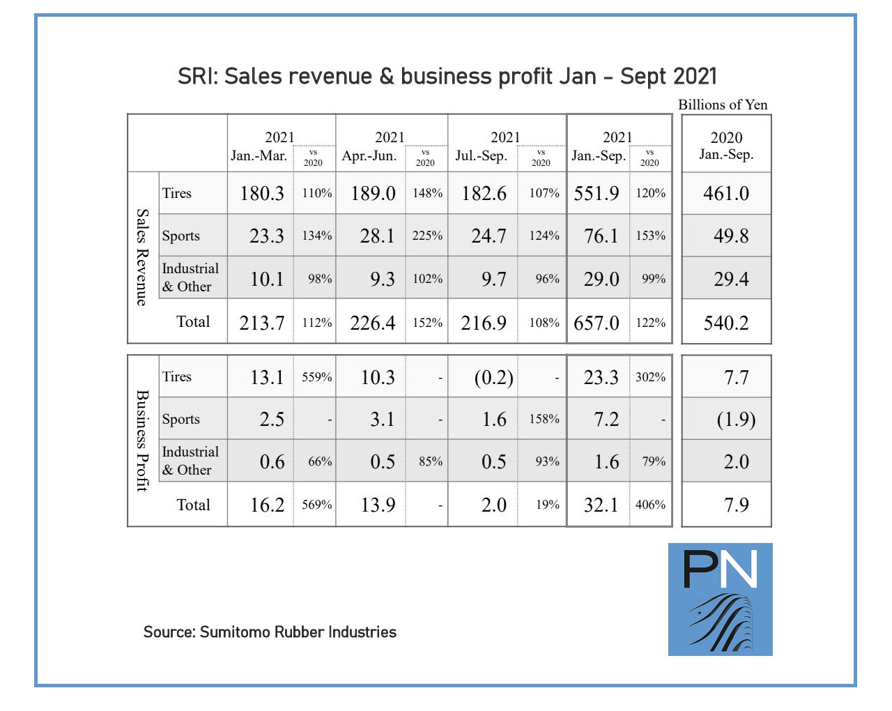 Sebbene le vendite di Sumitomo Rubber Industries (SRI) e in particolare i profitti per i primi nove mesi del 2021 …