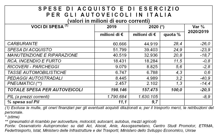 Nel 2020 le famiglie e le imprese italiane hanno speso 157,4 miliardi di euro per l’acquisto e l’esercizio di autoveicoli …